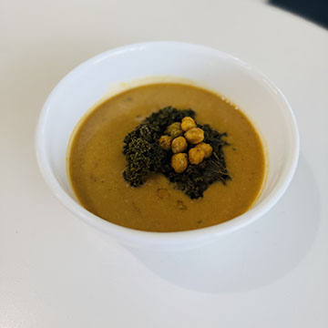 Rich coconut-based, silky squash soup with warm spices. Topped with braised kale and toasted chickpeas for intrigue.