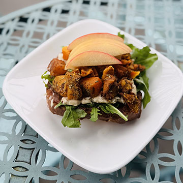 Bread of the moment layered with savory apple butter, smoked cashew mozzarella, arugula, roasted squash, and pickled apples.